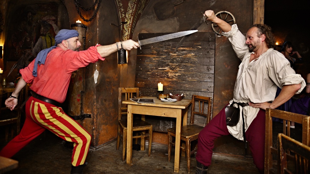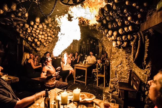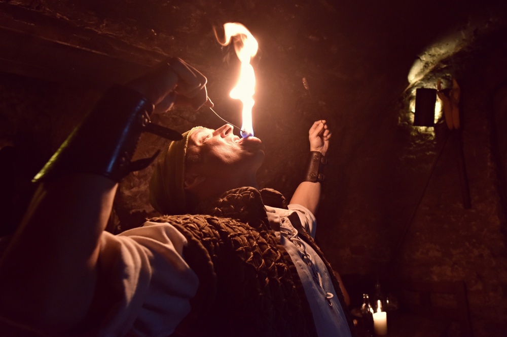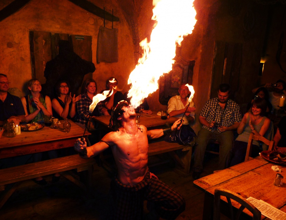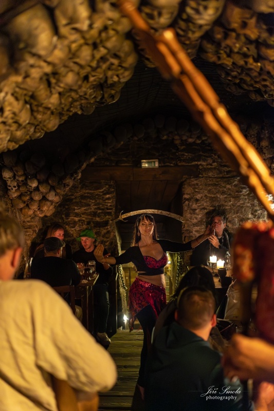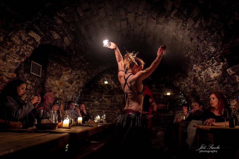 Dobový design staropražského podzemního labyrintu vytváří autentickou kulisu pro naprosto ojedinělý kulturně-gastronomický zážitek středověkou žranici s hudební, taneční a kejklířskou show.